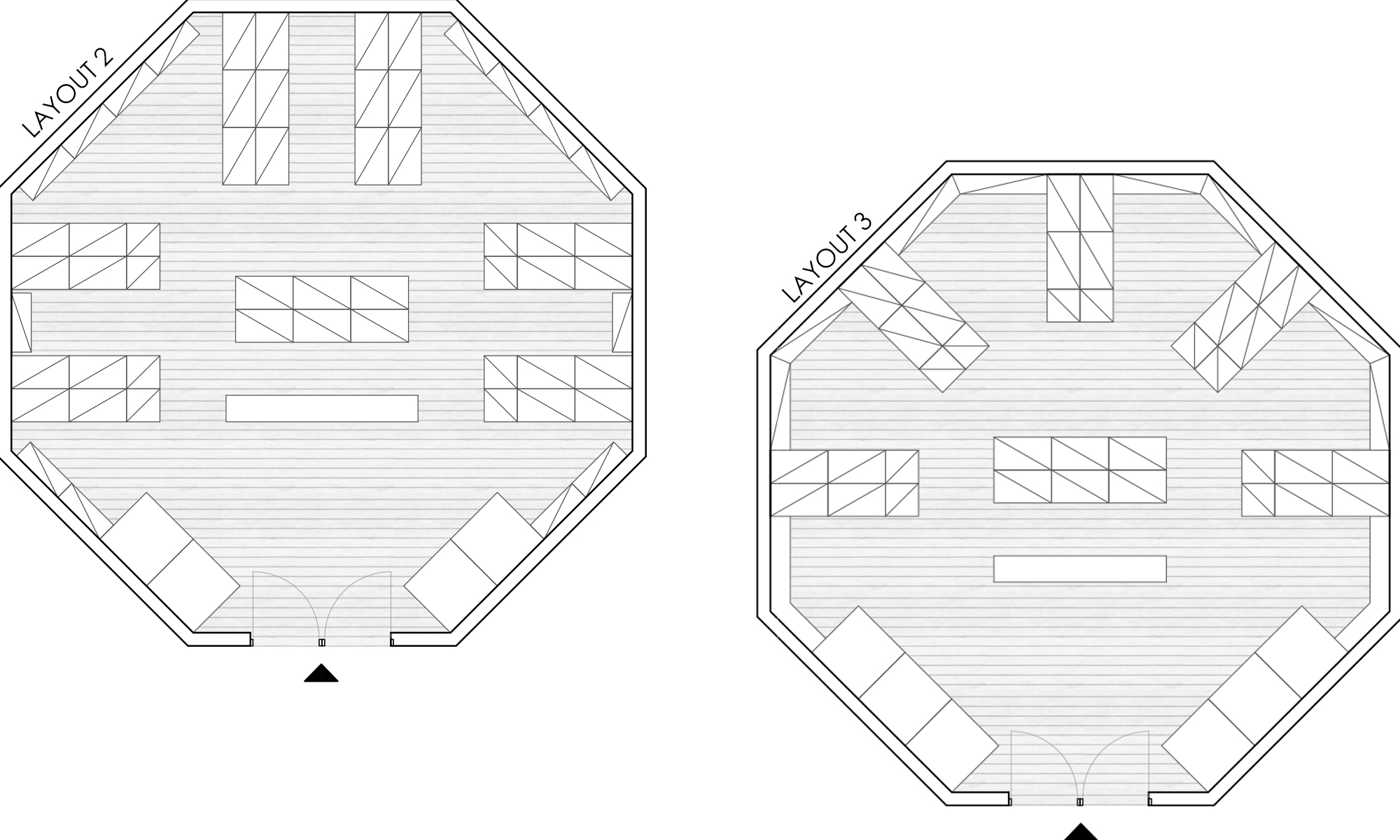 Nella seconda proposta invece si è lavorato sulla tipologia a pianta centrale, partendo dalla figura dell'ottagono e caratterizzando in maniera differente i lati della facciata, alternando le soluzioni applicate. Sulla facciata dell'ingresso principale e su quelle ad esse perpendicolari si è riproposto il tema della casa con tetto a falda, mentre sulle facciate diagonali si è utilizzata la soluzione del brisesoleil.