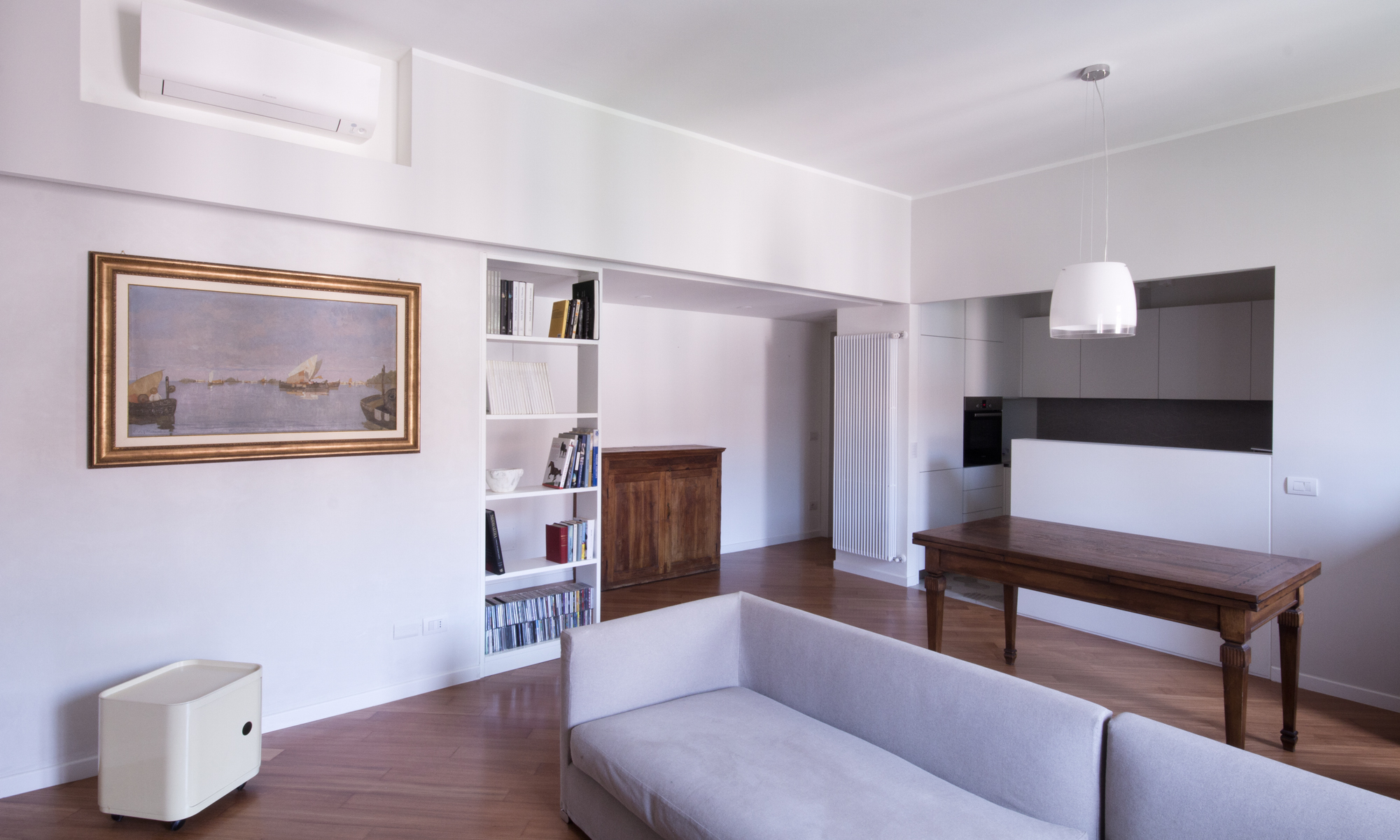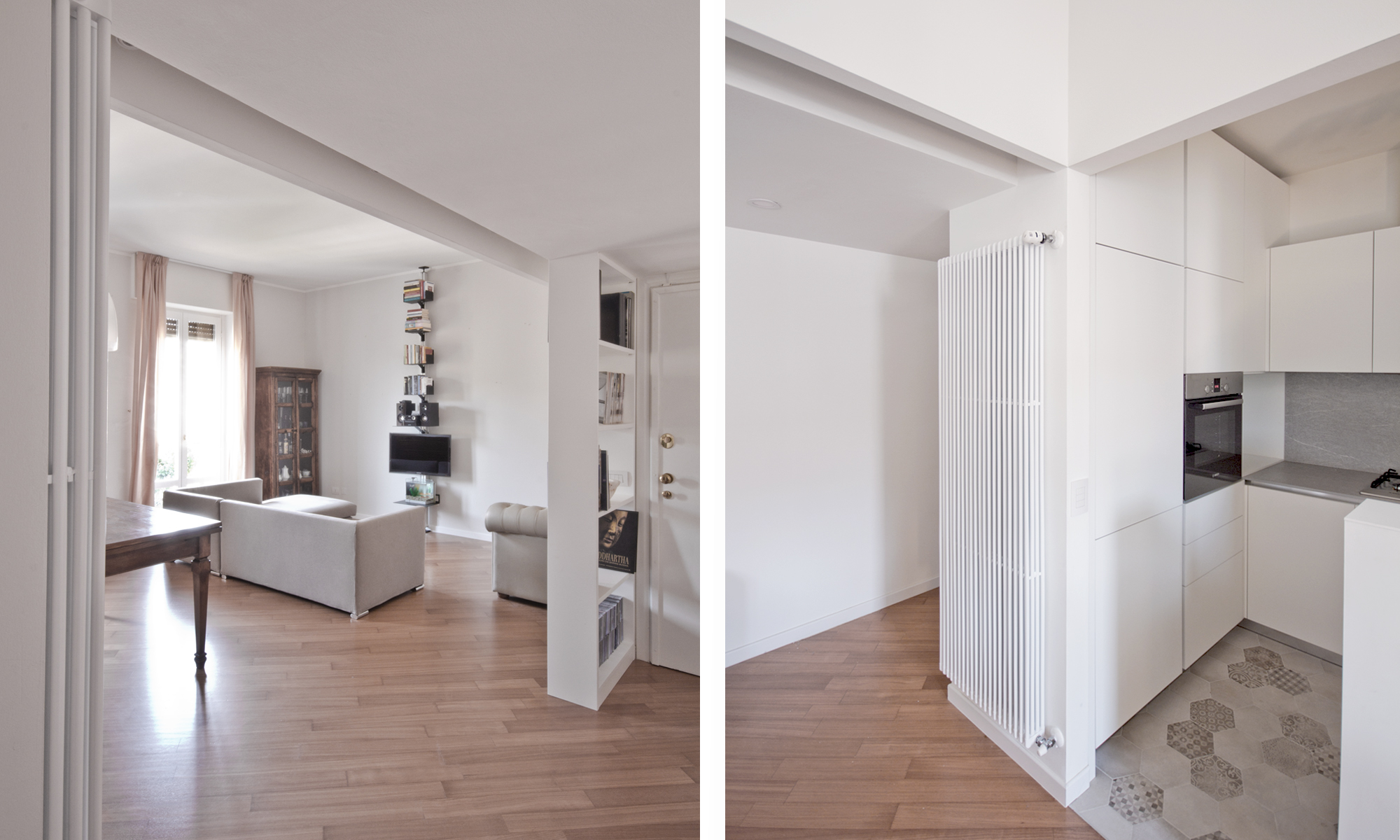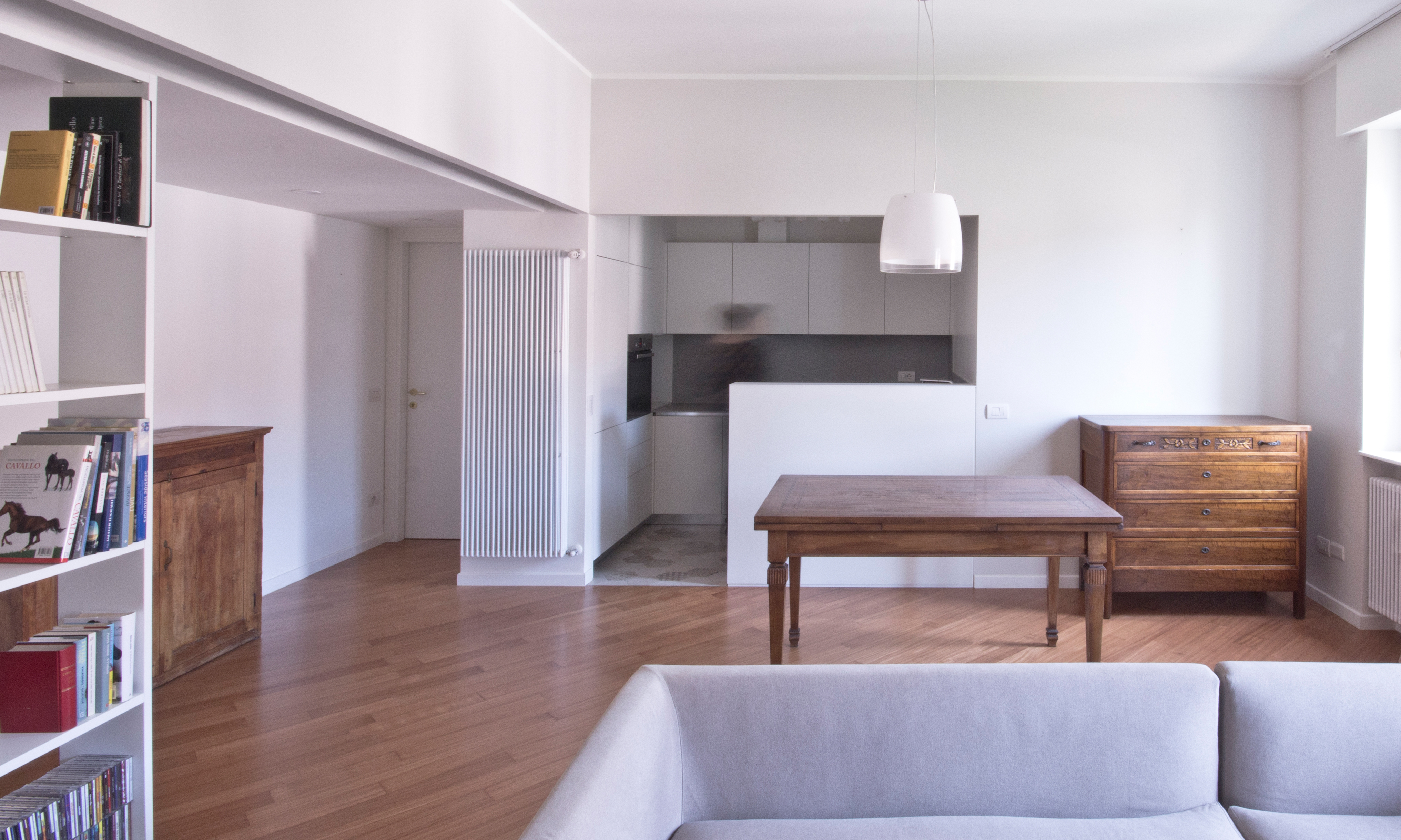 L'appartamento, risultato dalla suddivisione di un'unità su due piani, si trova all'interno di un edificio degli anni '70 nella zona Nord di Milano.