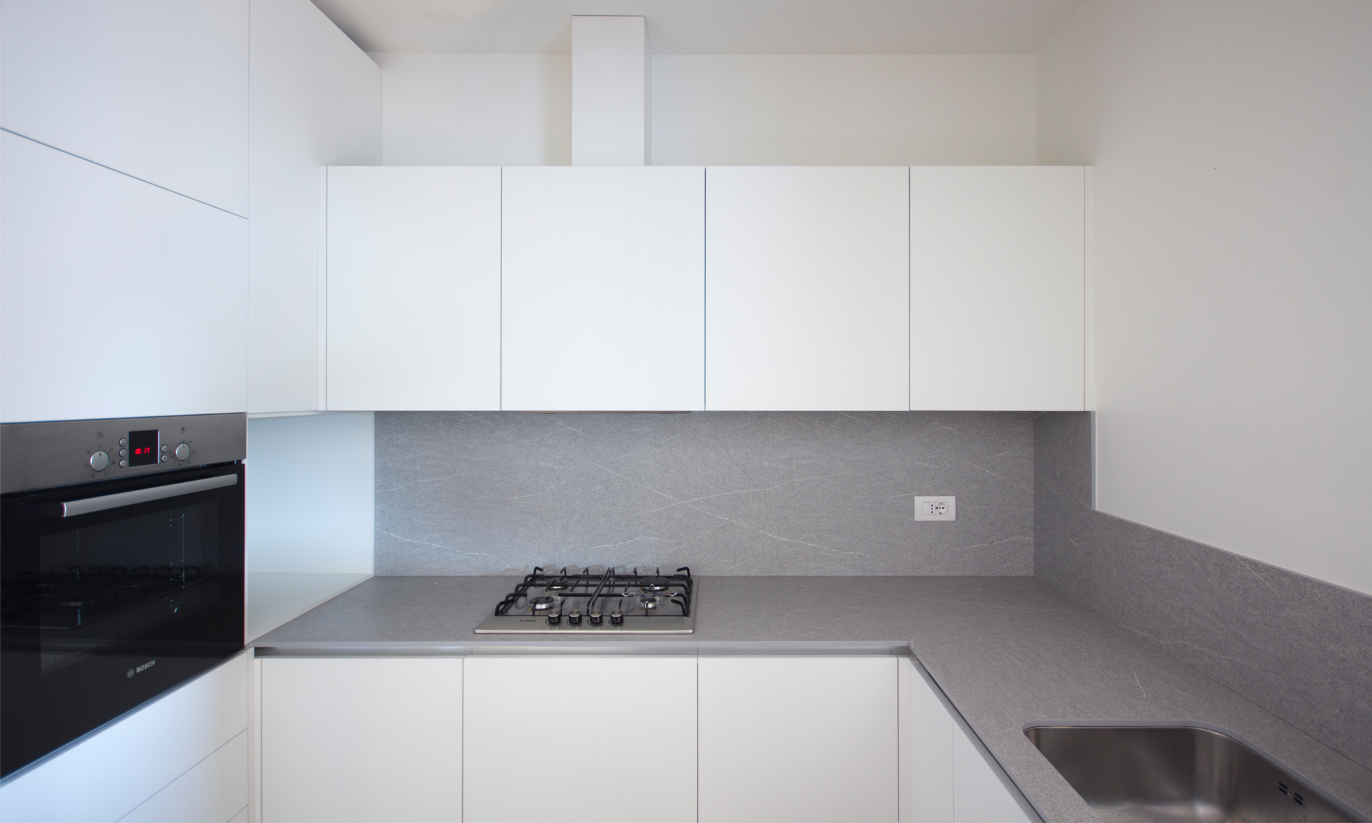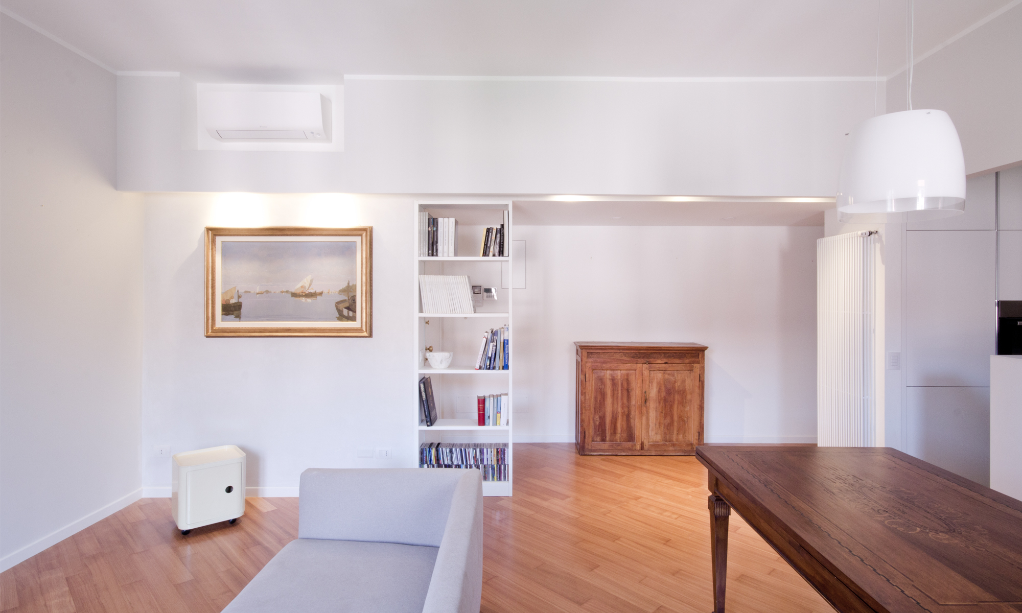 Nella zona giorno la continuità visiva è preservata. Lo spazio è fluido e si articola liberamente nei diversi ambienti che rimangono però identificati dalla presenza delle soglie disegnate da controsoffitti e pavimenti. Il soggiorno così acquista profondità grazie alla contiguita con ingresso e cucina.