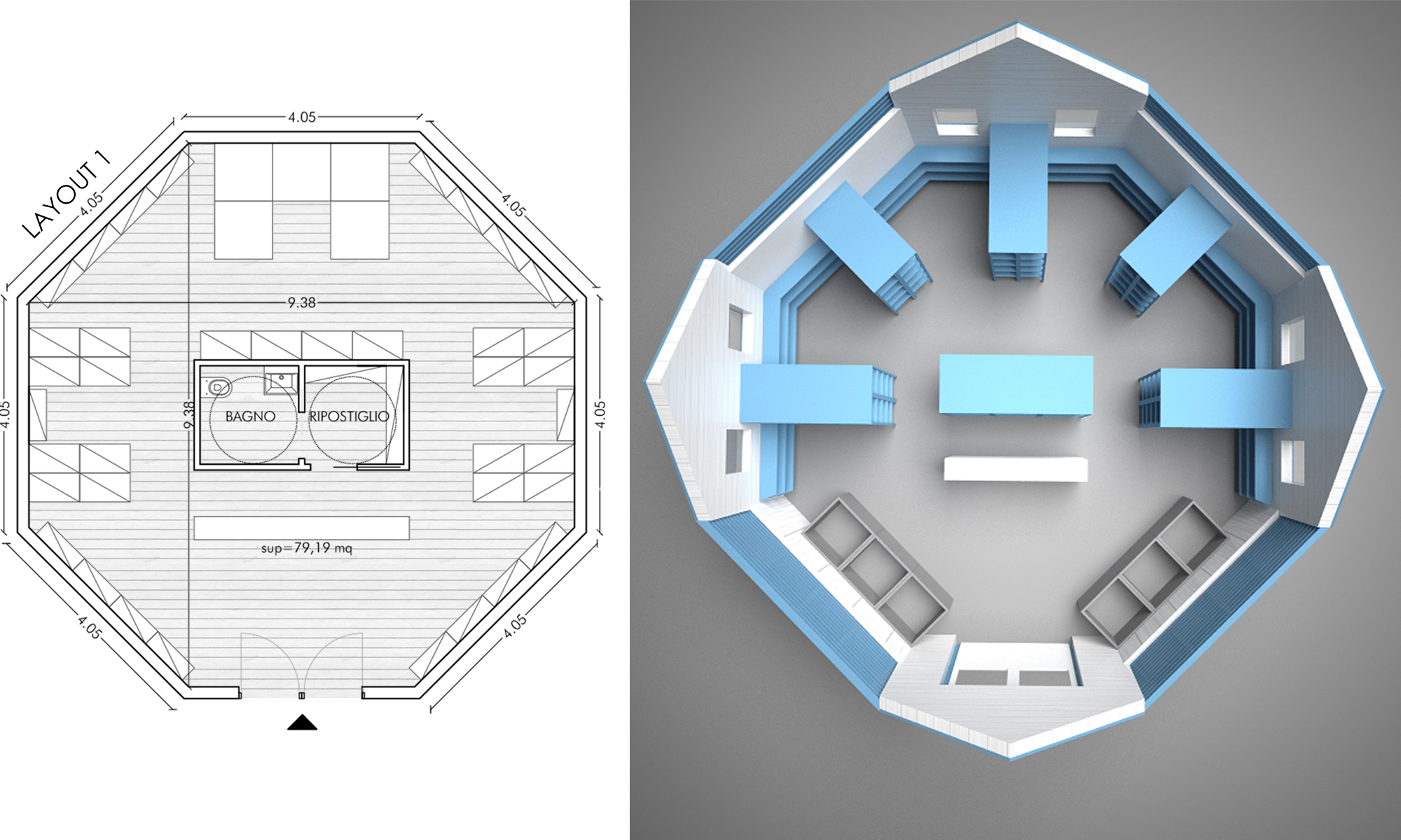 Nella seconda proposta invece si è lavorato sulla tipologia a pianta centrale, partendo dalla figura dell'ottagono e caratterizzando in maniera differente i lati della facciata, alternando le soluzioni applicate. Sulla facciata dell'ingresso principale e su quelle ad esse perpendicolari si è riproposto il tema della casa con tetto a falda, mentre sulle facciate diagonali si è utilizzata la soluzione del brisesoleil.