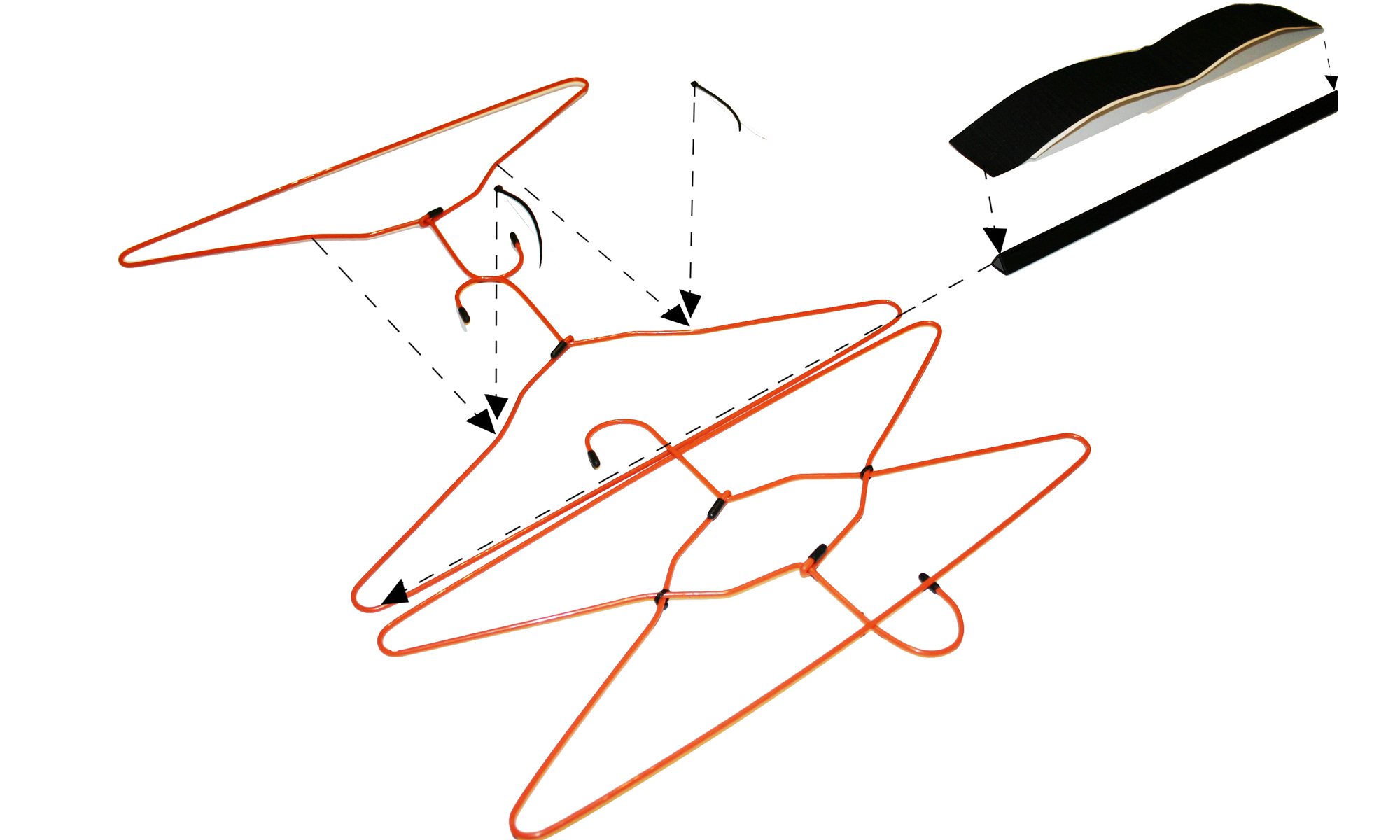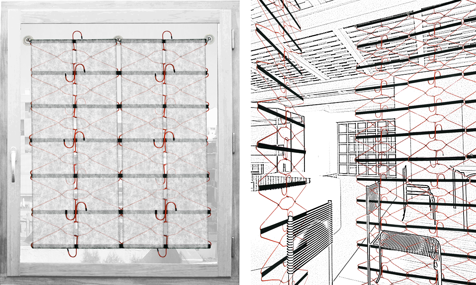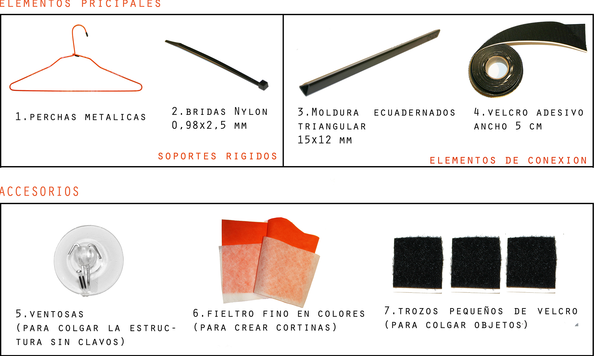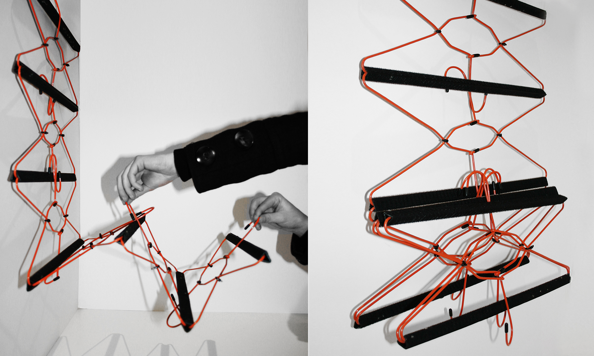 Per la sua realizzazione vengono vengono assemblati in secco elementi di uso comune (grucce , profili di plastica e velcro) reinterpretati secondo una logica di "uso alternativo".